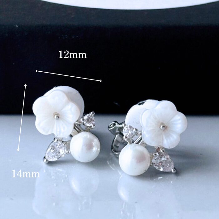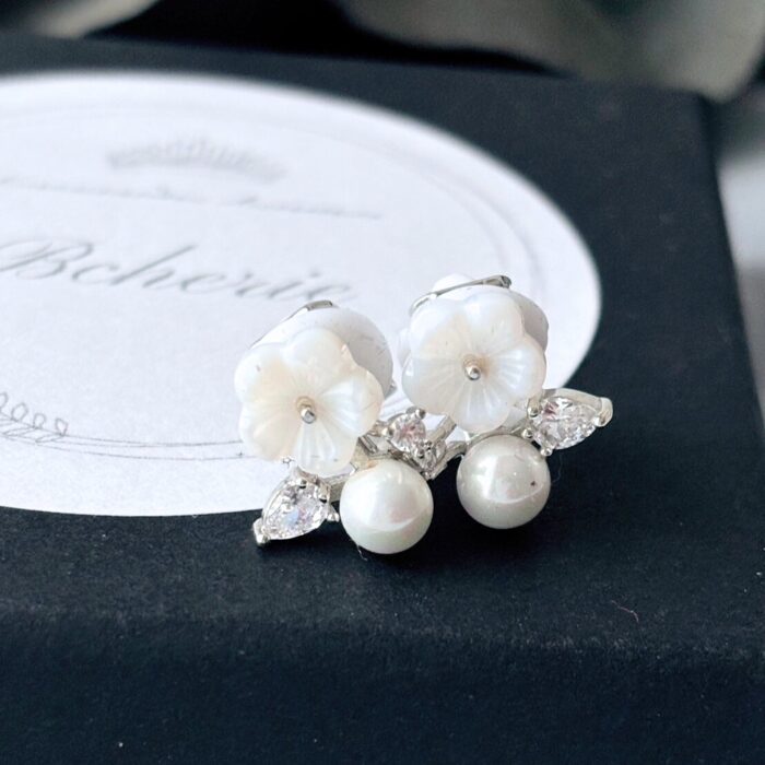耳元を引き立てる美しいビジューと、パールとフラワーモチーフが上品なイヤリング。
