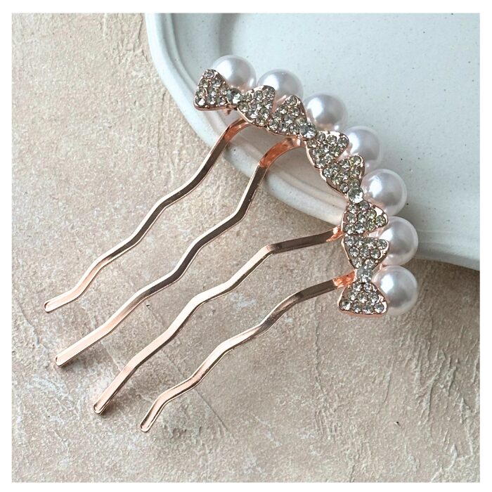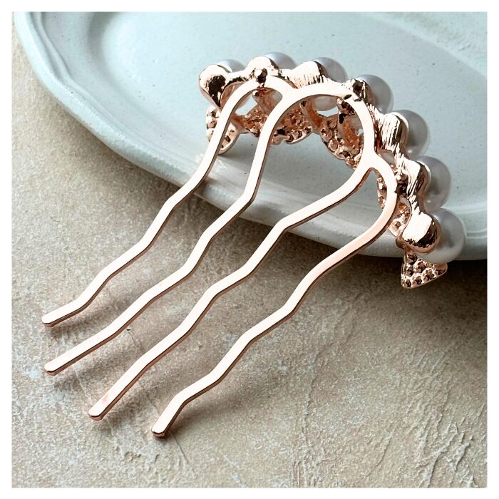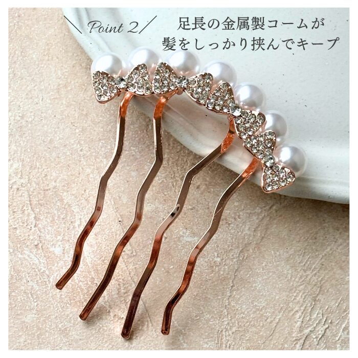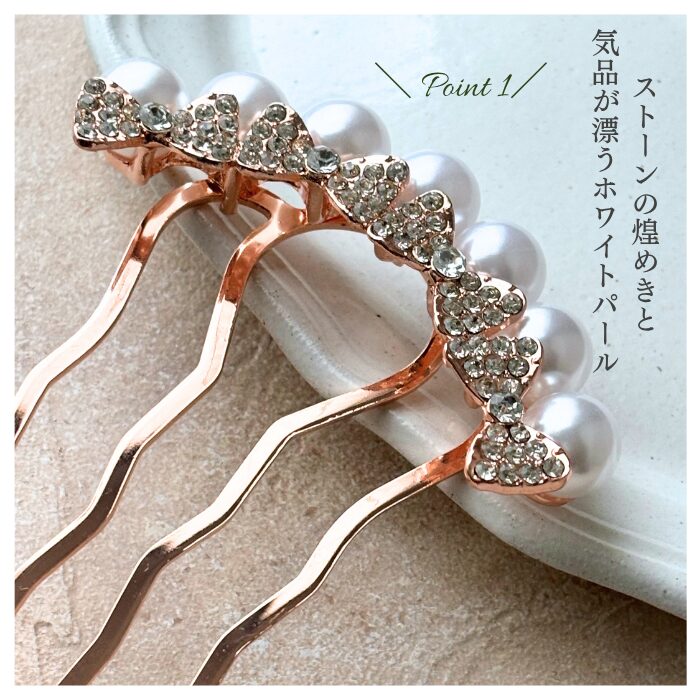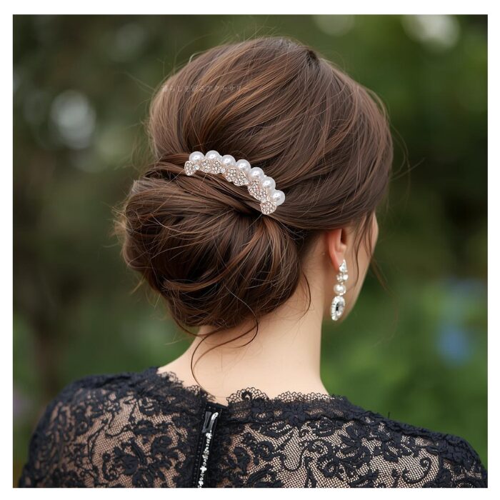 夜会巻きやアップスタイルのアクセントに映えるホワイトパールのヘアコーム。