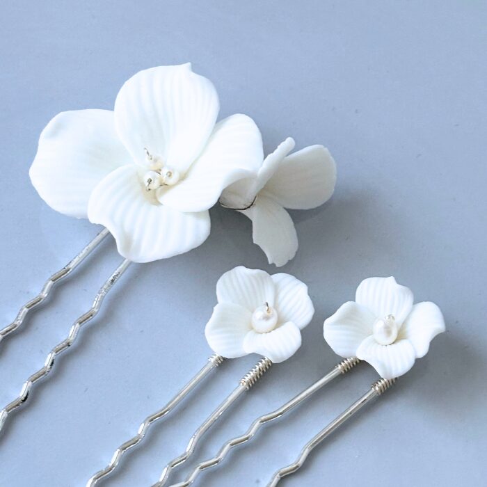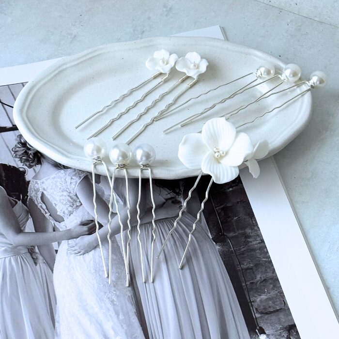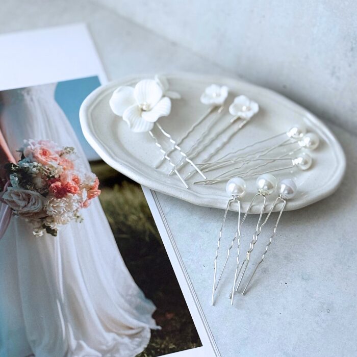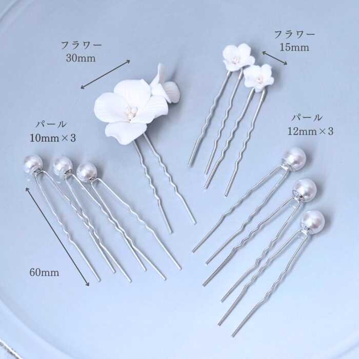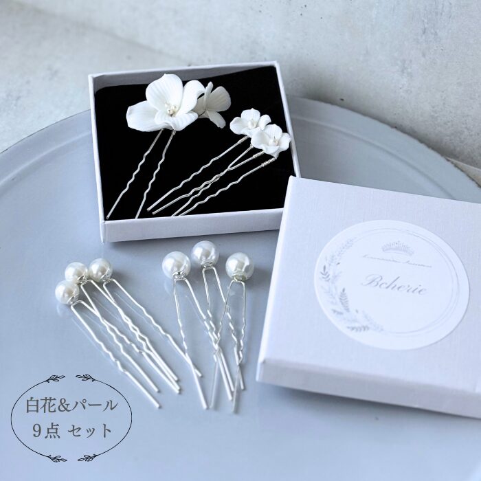 白いお花のピンとパールピンがセットになった9点セットの髪飾り。